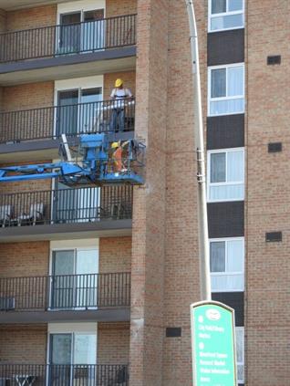 In the spring and summer of 2015, Sky-High undertook replacing approximately 1000 bricks in areas all over this 8-storey, 57-unit apartment building in Trenton, Ontario.